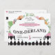 Ouçam, ouçam! Convide toda a sua família e amigos para a festa de primeiro aniversário com tema Alice no País das Maravilhas com estes divertidos convites de aniversário em postais. Apresenta designs florais e padrões nas cores rosa, verde menta e preto.