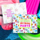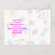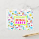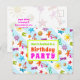 Convite de cartão postal para festa de aniversário de verão. Este design tropical de verão é perfeito para a festa de aniversário de uma filha adolescente, ou festa de final de ano letivo na piscina. O texto colorido combina com o divertido design de verão, que inclui imagens de óculos de sol, chinelos, estrelas-do-mar, palmeiras, conchas e mais, impressos sobre listras azuis claras e brancas. A frente tem três linhas para personalizar e dizer "Você está convidado para uma festa de aniversário" com outro modelo de texto no verso para as informações da festa. Todo o texto é fácil de alterar para qualquer tipo de festa.