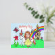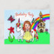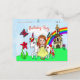 Um estilo de arte popular bonito desenho animado princesa desenhada à mão vermelha e unicórnio com castelo, flores e borboleta ao fundo. Uma ótima maneira bonita, mas acessível de distribuir muitos convites de aniversário divertidos de contos de fadas.