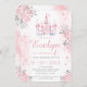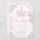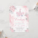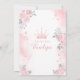 Um convite de aniversário da princesa do castelo, rosa e pastel, com flores prateadas cor-de-rosa.