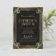 Convite de Aniversário de 16 anos preto e dourado no estilo Art Déco dos anos 20. Confira nossos cartões de resposta e recepção combinando.
