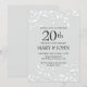 Comece sua festa de aniversário de casamento com o nosso convite de aniversário de 20 anos de casamento com um impressionante conjunto de flores de pérola branca sobre um fundo cinza claro. Convite perfeito para qualquer aniversário, aniversário de 30 anos de casamento, 40º aniversário, 50º aniversário, 10º aniversário, 5º aniversário, 60º aniversário ou 75º aniversário.