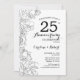 Convite de Aniversário de Casamento de 25 Anos Floral Preto e Branco. Design moderno minimalista com desenhos de contorno botânico e fonte de letra script. Cartão de convite elegante perfeito para uma celebração sofisticada. Pode ser personalizado para qualquer ano de casamento. Convites impressos da Zazzle ou modelo digital para impressão instantânea.