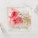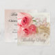 Uma bela imagem delicada de uma rosa em tons de rosa suave. Ao fundo, uma corda de pérolas. Todo o efeito é suavizado por uma pena delicada. Um convite de aniversário de 34 anos encantador. Altere o verso para os detalhes da sua festa