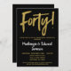 Um convite de aniversário de casamento de 40 anos preto e dourado, elegante, simples mas impressionante. Texto com letra glamorosa no topo e texto dourado abaixo com o nome em branco destacado