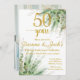 50 anos merece uma celebração! Este convite apresenta belos acentos de eucalipto e dourado. Todo o texto é editável (exceto o número 50 e a palavra anos).