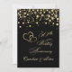 Convite de aniversário de 50 anos de casamento com corações unidos dourados e confetes redondos em fundo preto