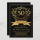 Convite de casamento de 50 anos apresentando uma moldura de floreio vintage com folha de ouro falso destacando "50º" com uma faixa moderna em um fundo preto clássico.