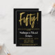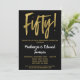Um convite de aniversário de casamento de 50 anos preto e dourado, elegante, simples mas impressionante. Texto com letra glamorosa no topo e texto dourado abaixo com o nome em branco destacado