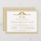 Este convite de aniversário de casamento de 50 anos apresenta duas silhuetas de pássaros, um divisor decorativo e uma borda com padrão dourado/marrom e branco. Está pronto para ser personalizado e é adequado para um aniversário de casamento de 50 anos semi formal.