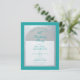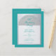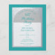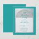 Um convite de aniversário moderno. Sobre um fundo retangular azul-teal, há um arco de folha de prata falso que contém texto azul-teal em fundo branco. As palavras Birthday Party estão escritas em uma fonte caligráfica elegante; a primeira linha é um texto arqueado.