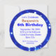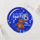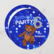 Uma festa de aniversário para crianças e ursos de pelúcia. Um ursinho de pelúcia castanho bonito com um arco azul dançando através de luzes azuis segurando uma brilha como a número 6 é um 6 giro para os rapazes. Personalize com o nome da criança e as informações da sua parte usando os modelos fornecidos. design original de Anura Design Studio.