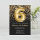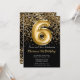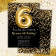 Convite de aniversário preto e 6 de ouro elegante para uma menina de 6 anos com script elegante escrevendo design de fonte dourada e balões de folha divertida.