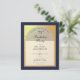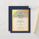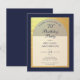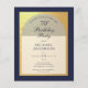 Um convite de aniversário moderno. Em um fundo retangular azul marinho, tem um arco de folha dourada falsa que contém texto azul marinho em fundo branco. As palavras Festa de Aniversário estão escritas em uma fonte caligráfica elegante; a primeira linha é texto arqueado.