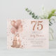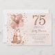 Este belo convite de aniversário 75º rosa com um bolo brilhante de ouro de 2 camadas com balões de ouro de rosa, o número 75 em ouro rosa e confete de ouro de rosa brilhante em blush seria perfeito para comemorar sua esposa, mãe, irmã, amiga, avó, excelente-avó. É tradicional e clássico enquanto é fresco, moderno e contemporâneo. As costas são uma adorável folha de ouro rosa coordenadora.