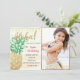 Cartão de Convite de Aniversário Tropical com Fotografia Personalizada, Dourada Moldura, Luzes de Corda e Abacaxi Tropical Dourado