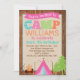 Nosso Convite de aniversário de acampamento feminino é o convite perfeito para qualquer festa do ar livre, quintal ou acampamento. Este design apresenta um fundo estilo de madeira, sotaques de xadrez e gráficos de acampamento divertidos, como uma fogueira, marshmallows e tenda de acampamento. Personalize com seus detalhes de festa um convite completamente personalizado.