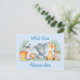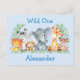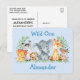 Convite de Aniversário de Primeira Idade Safari Jungle Animais Selva. Os bebês animais incluem Elefante, Macaco, Girafa, Rinoceronte, Zebra e Leão em folhas de feto. Vegetação Botânica Aquarela. Texto Azul.