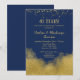 Um convite de aniversário de casamento elegante azul marinho e dourado com poeira de confete dourado no topo e brilho dourado no fundo.