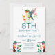 Feliz convite de 8 anos com beija-flores coloridas e convite de aniversário personalizável.