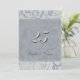 Um elegante padrão de damasco floral cinza prateado e azul vintage é o fundo para este lindo convite de celebração de aniversário de casamento de prata formal. Um campo transparente correspondente contém o número estilizado 25 e os primeiros nomes do casal aniversariante em texto cinza escuro. Linhas finas de prata bordam o campo transparente, iluminando a frente e chamando a atenção para as suas informações. O verso do convite é cinza claro correspondente, com o seu texto personalizado em cinza mais escuro correspondente.