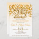 Este é um convite de festa de aniversário de 25 anos de casamento com tema de brilho dourado e confete. 25