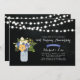 Um convite de aniversário de casamento rústico elegante com jarra de mason e buquê de flores com um fundo de quadro negro.