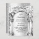 Um grande arco de mármore decorado com flores e diamantes falsos. Personalize e adicione os detalhes da sua festa. Um fundo com aparência de prata falsa.
