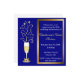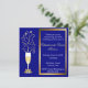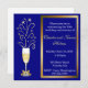 Convite de Aniversário de Casamento Elegante, feito com cartão reciclado que tem fundo azul, texto branco e detalhes em dourado. Um copo de champanhe, com um laço dourado doce no caule, tem estrelas cintilantes saindo do topo do copo, e uma moldura em tom dourado envolve a área do texto. Personalize todo o texto para a sua festa. Convite muito deslumbrante.