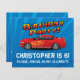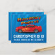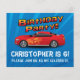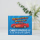 Folheto de convite. Os meninos adoram carros de corrida de brinquedos que aceleram a corrida. Este carro de esportes de automóveis vermelho é um verdadeiro vencedor. Fundo azul brilhante com chamas laranja e amarelas e texto e cores vibrantes e brilhantes para a cara de aniversário de 6 ou qualquer idade! Design Copyright © CustomInvitesOnline.com