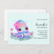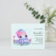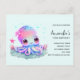 Cartão postal de convite de aniversário com imagem de um polvo fofo e feminino com uma flor na cabeça. Olhos grandes e brilhantes e um rosto amigável.