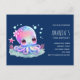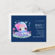 Convite de aniversário com cartão postal com uma imagem de um polvo fofo e feminino com uma flor na cabeça. Olhos grandes e brilhantes e um rosto amigável.