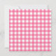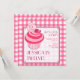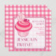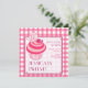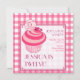 Um convite de aniversário com um fundo de gingham rosa na frente e atrás. A frente mostra uma ilustração de um cupcake de framboesa no topo à esquerda. Personalize o número na parte superior do cupcake. Personalize o texto por baixo e à direita do cupcake com detalhes da sua ocasião. Texto rodeado por quadro rosa.