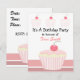 Um doce convite de aniversário com uma fileira de cupcakes no topo. Um grande cupcake com uma embalagem rosa e cobertura rosa decorado com uma cereja acentua a parte inferior. Listras rosa também acentuam a parte inferior. Personalize com todas as suas informações de aniversário conforme desejado.