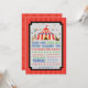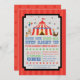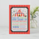 Este divertido Convite de aniversário do Circus Carnival apresenta um selo de espetáculo e um macaco, uma tenda de circo e uma armação decorativa. O fundo é um padrão vermelho listrado.