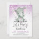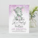 Convite de festas de primeiro aniversario de elefante roxo/lavanda. Fundo de aquarela e striped para trás.