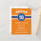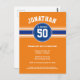 Listras azuis reais e um fundo laranja destacam este convite de aniversário temático de esportes. O design inclui um design de camiseta de esportes com uma área para destacar o nome e a idade do aniversariante.