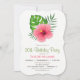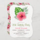 Convite de aniversário temático de Luau tropical havaiano de Verão. O convite apresenta Flores de Hibisco Rosa e Folhas verdes.