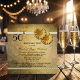 Um convite de festa de aniversário elegante em estilo vintage com margaridas douradas em um fundo de aniagem.