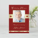Este fabuloso convite de aniversário de burgundy apresenta uma fotografia como o ponto focal rodeado por um quadro de ouro com bares ouros rodando em cada lado com forma de diamante através de cada bar. Acima da imagem, estão as palavras "Celebrando 70 anos" e abaixo estão as palavras "Por favor, junte-se a nós para homenagear" e, em seguida, o nome do celebrante do aniversário. No verso do convite, você pode colocar todos os detalhes importantes da sua festa de aniversário de 70 em uma cor burgundy coordenada. Direitos autorais