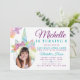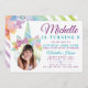 Na moda, moda e mágica química, fantasia floral de aquarela, unicórnio temático design de convite de aniversário fotográfico em uma paleta colorida de cores coloridas do arco-íris que criam um design bonito e mágico. O design apresenta florais e uma ilustração de unicórnio. Colocação de fotos onde você pode colocar sua própria foto. O verso apresenta um padrão de stripe de aquarela multicolorido arco-íris com lindos florais de aquarela que complementam lindamente o trabalho de arte frontal. Todas as ilustrações continham um convite de aniversário de fotos unicórnio de fantasia mágica são obras de arte originais desenhadas à mão pela Moodthology. Você pode personalizar o tamanho do texto, a cor do texto, a fonte e o layout para sua preferência de design pessoal.