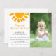 Está planejando uma primeira festa de aniversário de uma garota com temática solar? Este belo convite orçamentário é decorado com uma aquarela amarela, sol e tipografia de na moda. Facilmente personalizável com sua foto e detalhes. Original Watercolor © Michele Davies.