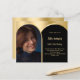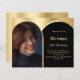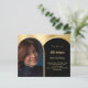 Adicione sua própria foto de tamanho vertical. Um quadro fotográfico em forma de arco. Uma cor de fundo dourada preta e falsa. Personalize e adicione um nome e detalhes da parte. 1 folha = 1 convite impresso de borda a borda.