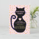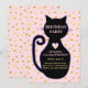 Convite de aniversário com gatinho fofo e bolinhas douradas em fundo rosa. Todos os textos e números estão prontos para serem personalizados.