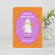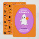 Convite de festa de aniversário de Halloween moderno com fantasminha e abóbora para bebê. O texto está pronto para ser personalizado.