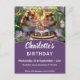 Neste cartão postal de convite de aniversário, com tema de hamster, dois adoráveis hamsters sírios ouros estão prontos para celebrar um aniversário especial. Os hamsters estão confortavelmente aninhados entre o verde-luxuoso e as delicadas flores roxas e balões suavemente flutuando em fundo quente e iluminado pelo sol. Os hamsters comemoram com um bolo de aniversário escondido adormecido com gelo grosso e borrifados coloridos, empalhados com velas brilhantes prontas para um desejo de aniversário.conteúdo generativo