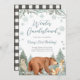 O design do convite pode ser para qualquer idade, todo o texto é editável. Personalize este convite de aniversário de sonho com aquarela. Caracteriza animais da floresta, urso, esquilo, coelho, coruja, neve nas árvores, flocos de neve e folhagens. Perfeito para um tema de inverno e festa de primeiro aniversário.