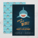 Os convites de aniversário temáticos de tubarões legal apresentam um tubarão sorridente nadando em um mar azul escuro, com "junte-se a nós para uma picada" embaixo. Personalize com os detalhes da sua festa de aniversário fina-tática abaixo. Convites invertendo um padrão de tubarão correspondente.
