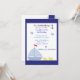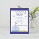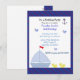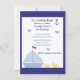 Uma cena fofa de um barco à vela azul suave com patinhos amarelos na água e pássaros azuis no céu. Uma borda listrada diagonal azul e vermelha. Um símbolo de âncora! Personalize com todas as informações de aniversário conforme desejado.