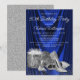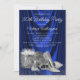 Convite de festa de aniversário azul royal e prata para mulher com belos sapatos de salto alto prateados, frasco de perfume e presentes em um belo fundo de cetim azul royal. Este convite de aniversário azul royal para mulher é facilmente personalizado para o seu evento bastando adicionar os detalhes do evento.